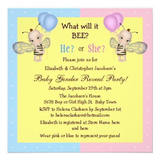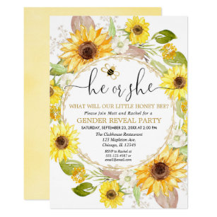 Honey Bee Gender Reveal Invitations. Personalize it with photos & text or purchase as is!. Invite your friends & family to share in the surprise of a BOY or a GIRL with this gender reveal party invitation.