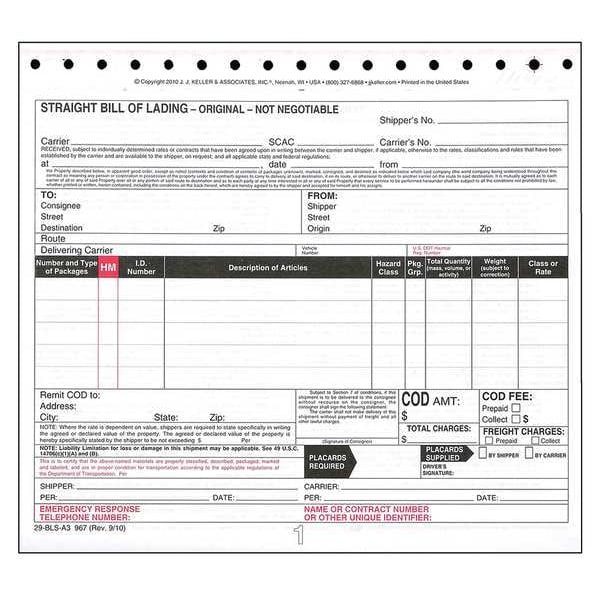 Jj Keller 967 $119.49 Bill of Lading Form, Reg Compliance ...