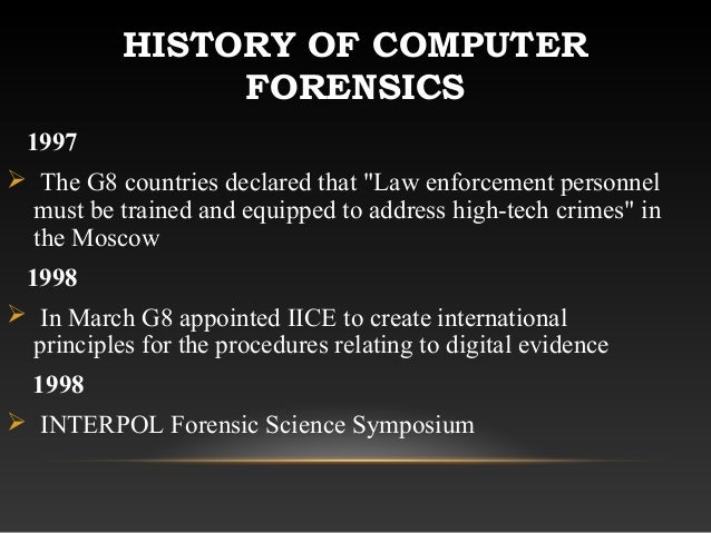 History Of Computer Forensics Timeline. First International Conference on Computer Evidence held. North Texas Regional Computer Forensics Laboratory, Dallas, Texas (www.ntrcfl.org/index.cfm).